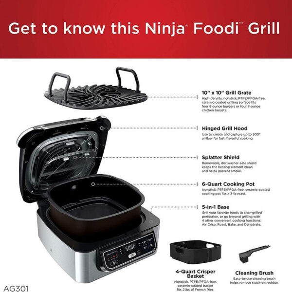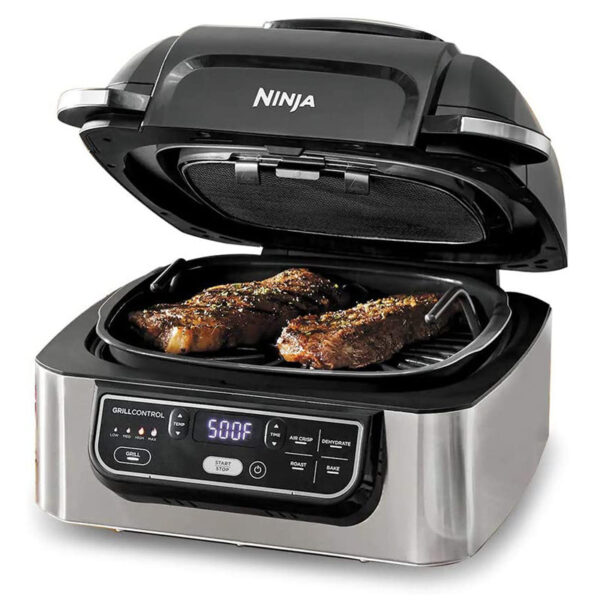 دارای برنامه های ( سرخ کن ، گریل ، میوه خشک کن ، کباب و پخت کیک و …) برنامه گریل قابل تنظیم ۴ حالت پخت از کم ، متوسط ، زیاد و حداکثر توان قابلیت تنظیم دما و زمان به صورت دستی و دلخواه تمام ظروف پخت و پز نچسب با روکش سرامیک و عاری از PTFE و PFOA ابعاد صفحه مخصوص گریل ۲۵.۴ در ۲۵.۴ سانتی متر ظرفیت ظرف مخصوص پخت ۶ لیتر ظرفیت ظرف مخصوص سرخ کردن ۴ لیتر گردش هوا با دمای حداکثر ۲۶۰ درجه سانتی گراد در محفظه دارای تکنولوژی گریل smoke free بدون دود