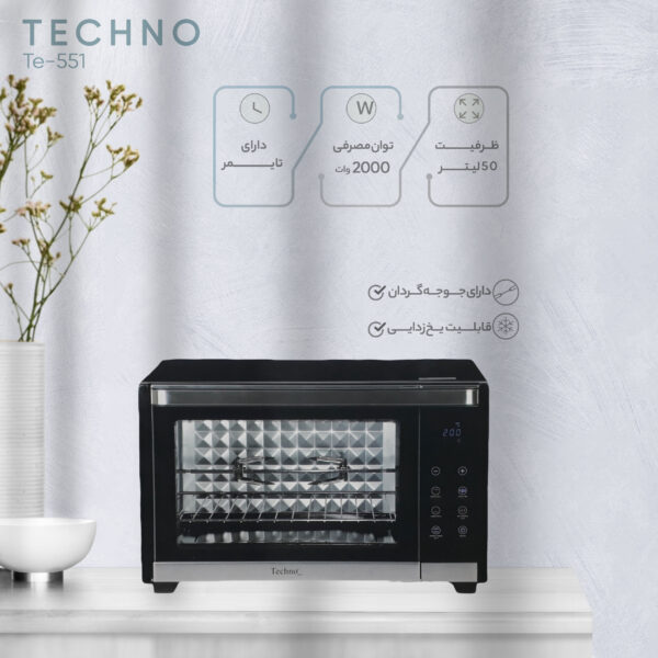 آون توستر «تکنو» مدل «Te-551» یکی از محصولات کاربردی و با طراحی ساده است که توسط این برند تولید شده است. این دستگاه یکی از آون توسترهای با ظرفیت نسبتا زیاد محسوب میشود و گنجایش 50 لیتر را داراست و میتواند انتخابی مناسب برای افرادی با خانوادههای با جمعیت متوسط باشد. فضای داخلی بزرگ دستگاه مزیتی است که اجازه قرار دادن غذاهای حجیمتر یا قرار دادن غذا در دو طبقه را به کاربر میدهد. همچنین این محصول امکان استفاده بهعنوان یک جوجهگردان را نیز دارد و یک سیخ جوجهگردان به همراه آن به کاربر ارائه میشود. این آون توستر دارای قدرت 2000 وات است. بر روی بدنه دستگاه و در سمت راست در آون توستر، پنل تنظیمات قرار گرفته است . این پنل امکان تنظیم دمای کار، انتخاب المنت حرارتی و تنظیم زمان پخت را به کاربر میدهند. المنتهای حرارتی این آون توستر امکان استفاده از آنها در سه حالت بالا، پایین و همزمان بالا و پایین وجود دارد. آون توسترها یکی از محصولات کاربردی بین لوازمخانگی محسوب میشوند. آون توستر درواقع یک اجاق کوچک است که توسط آن میتوان تمامی غذاها را گرم کرد، دوباره پخت، تست و برشته کرد و حتی بعضی غذاها را یخزدایی کرد. آون توستر«Oven Toaster » نهتنها ازبس برشته کردن نان صبحانه شما برمیآید، بلکه با توجه به ساختار آن میتوانید انواع غذاهای خود را در آن گرمکنید، سبزیجات و گوشت خود را در آن گریل کنید و یا پیتزا و همبرگر خانگی بپزید. اگر که دستگاه آون توستر شما دارای سیخهای جوجهگردان باشد هم میتوانید از آنها برای برشته کردن و پخت یکنواخت مرغ استفاده کنید. شرکت تکنو با طراحی آون توستر مدل «Te-551» کار شمارا برای تهیهی غذاهایی ماندد پیتزا، ساندویچها و غیره راحت کرده است. برند تکنو تحت لیسانس ایتالیا است و مونتاژ محصولات آن در ایران انجام میشود. این برند با نزدیک به نیمقرن سابقه درخشان در صنعت لوازمخانگی، جز برندهای محبوب در بازار ایران است. در ادامه برای بررسی کامل آون توستر تکنو مدل «Te-551» همراه ما باشید.